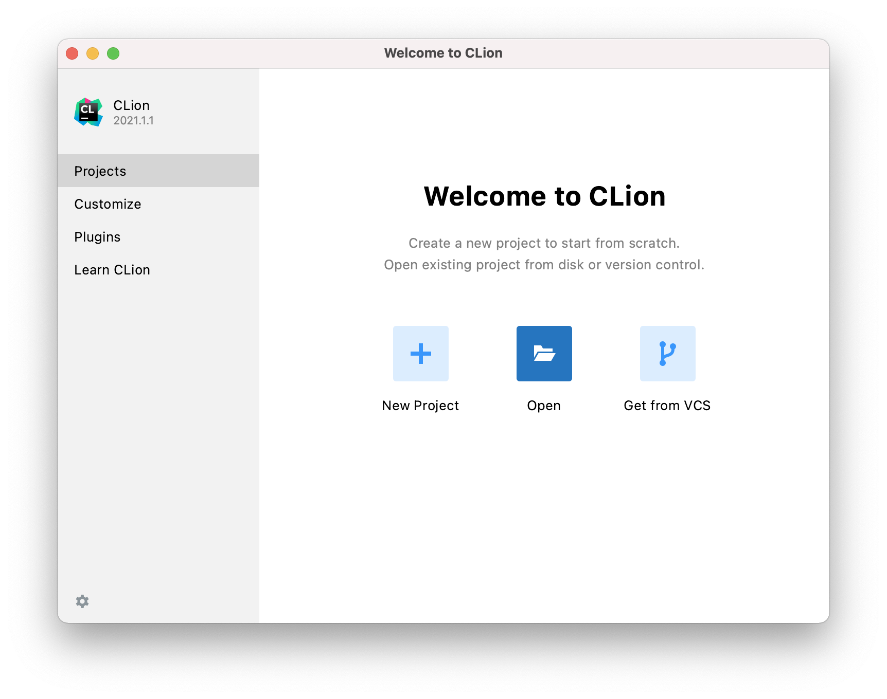 Launch CLion to get to the welcome screen and choose to open a project from existing sources.