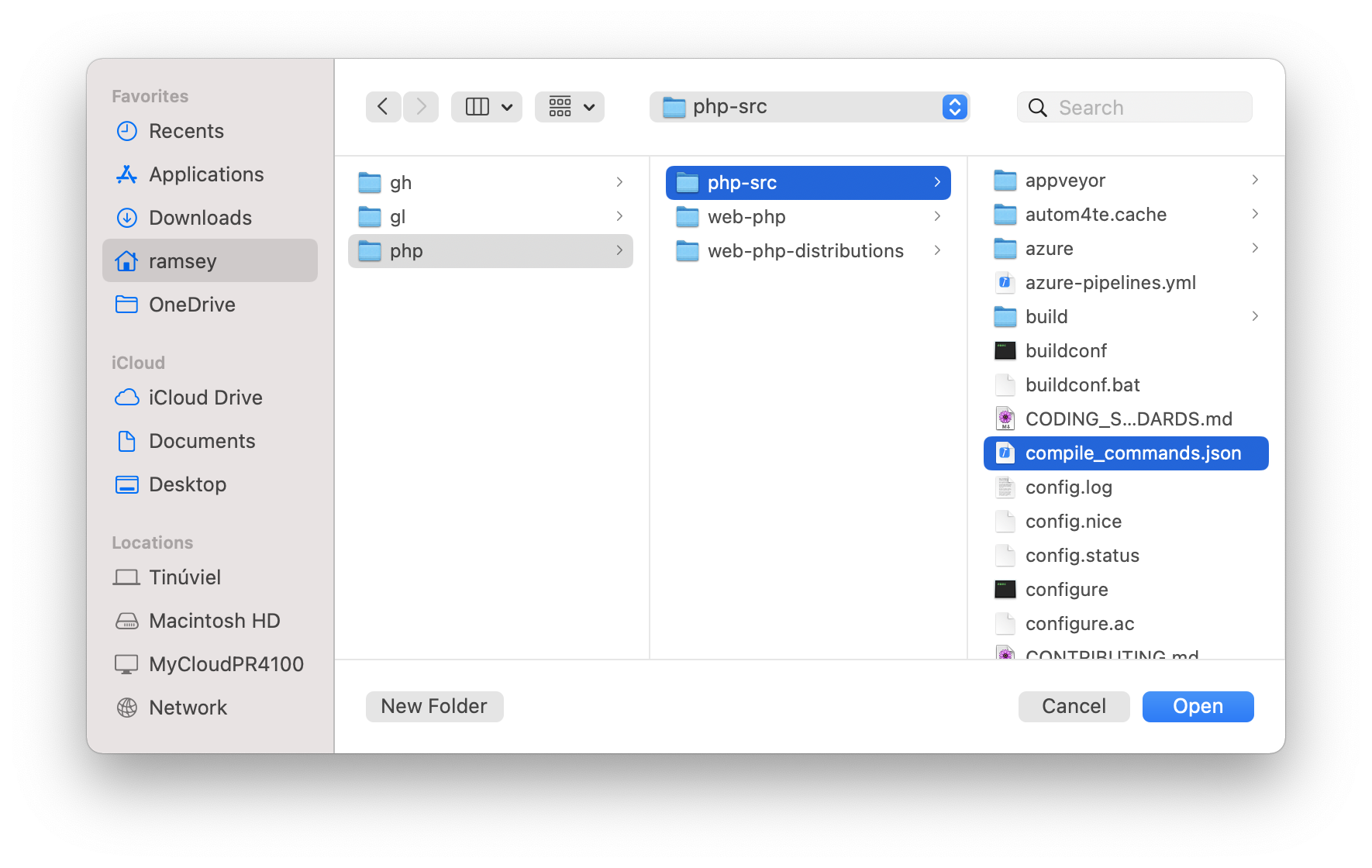 Browse to your php-src folder and, rather than selecting the folder to open, select the compile_commands.json file that compiledb generated.