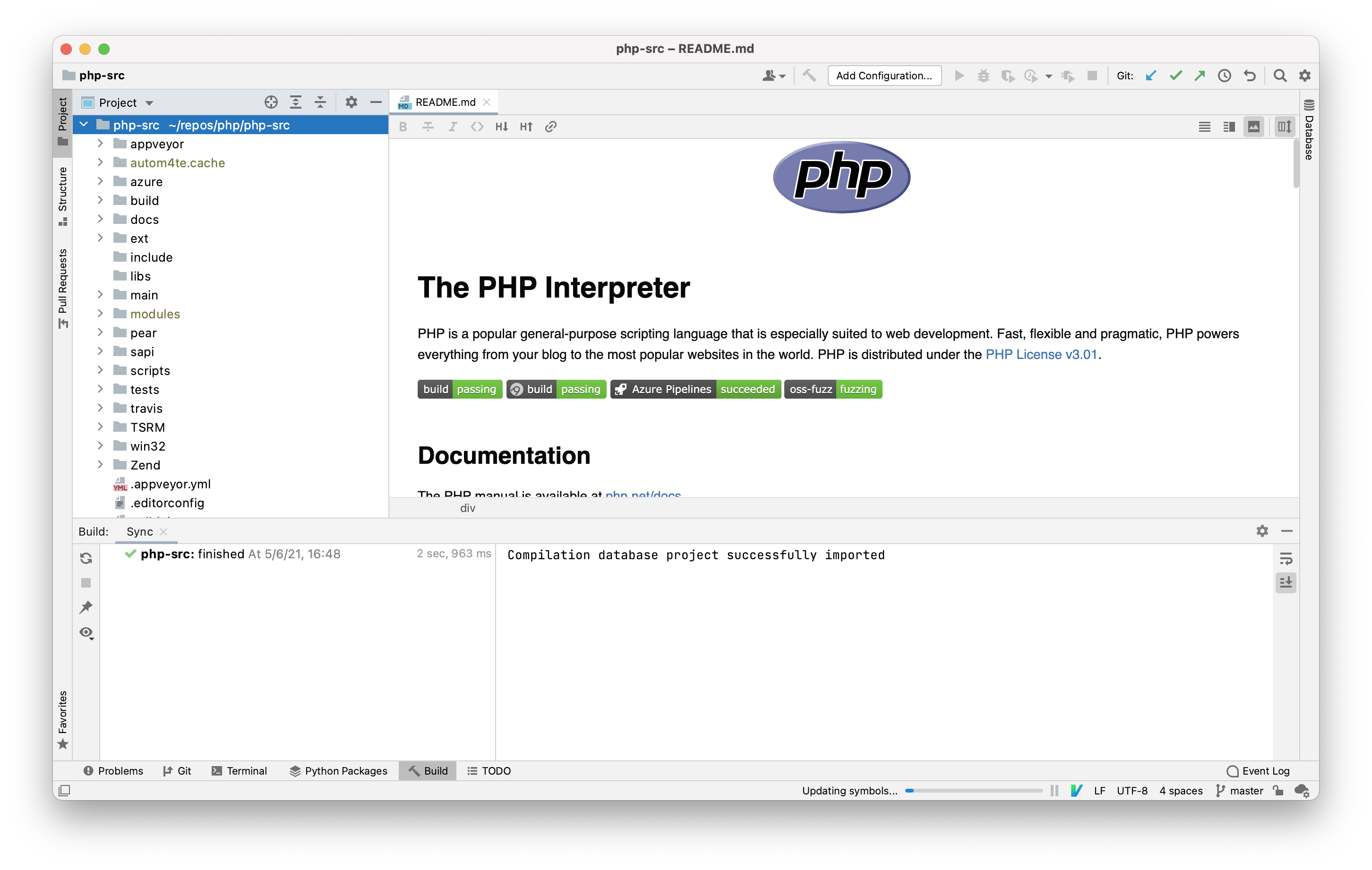 Now that php-src has a compilation database (which needs to be updated each time you change your build with configure or if you add new sources that get included in make), you can open it in CLion.