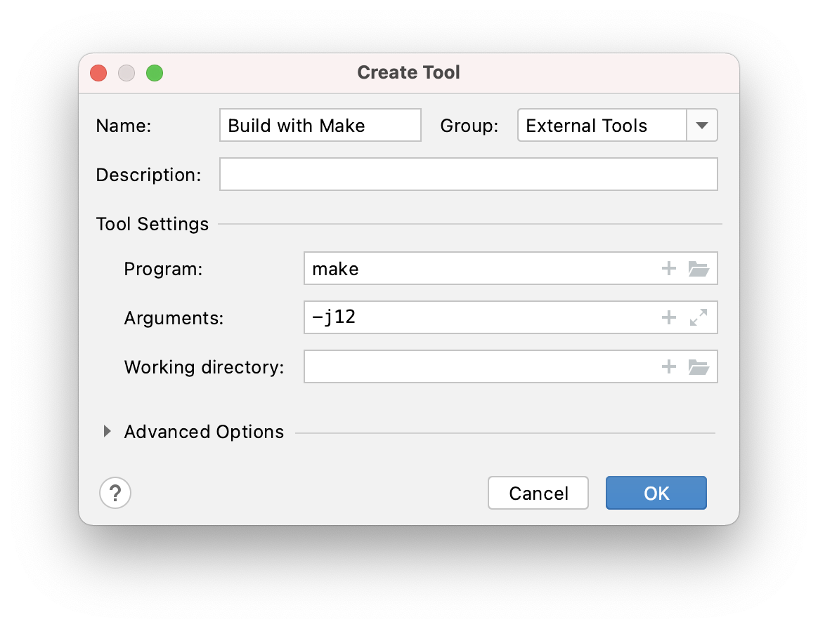 I named the first one “Build with Make.” The program is make and I added -j12 to the arguments for a faster build (see earlier). You might also consider using compiledb as the program, with make -j12 as the arguments.