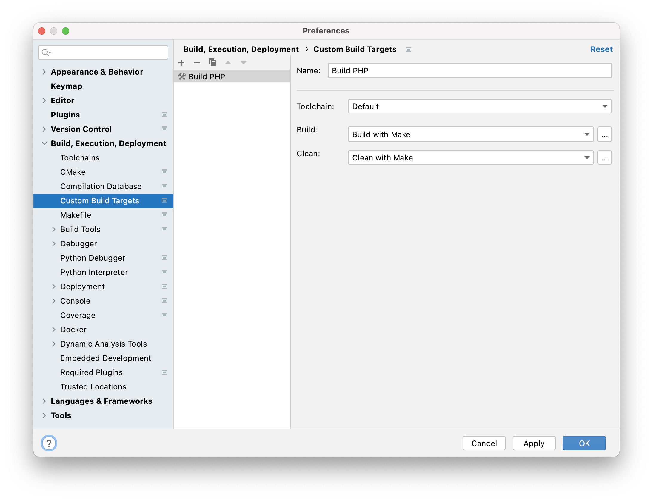 Open CLion Preferences and go to Build, Execution, Deployment -> Custom Build Targets. Create a new build target, named something like “Build PHP.” Then, next to the empty Build and Clean fields, click the more button (with three dots). This will open an External Tools window. Use the +-button here to create two external tools.