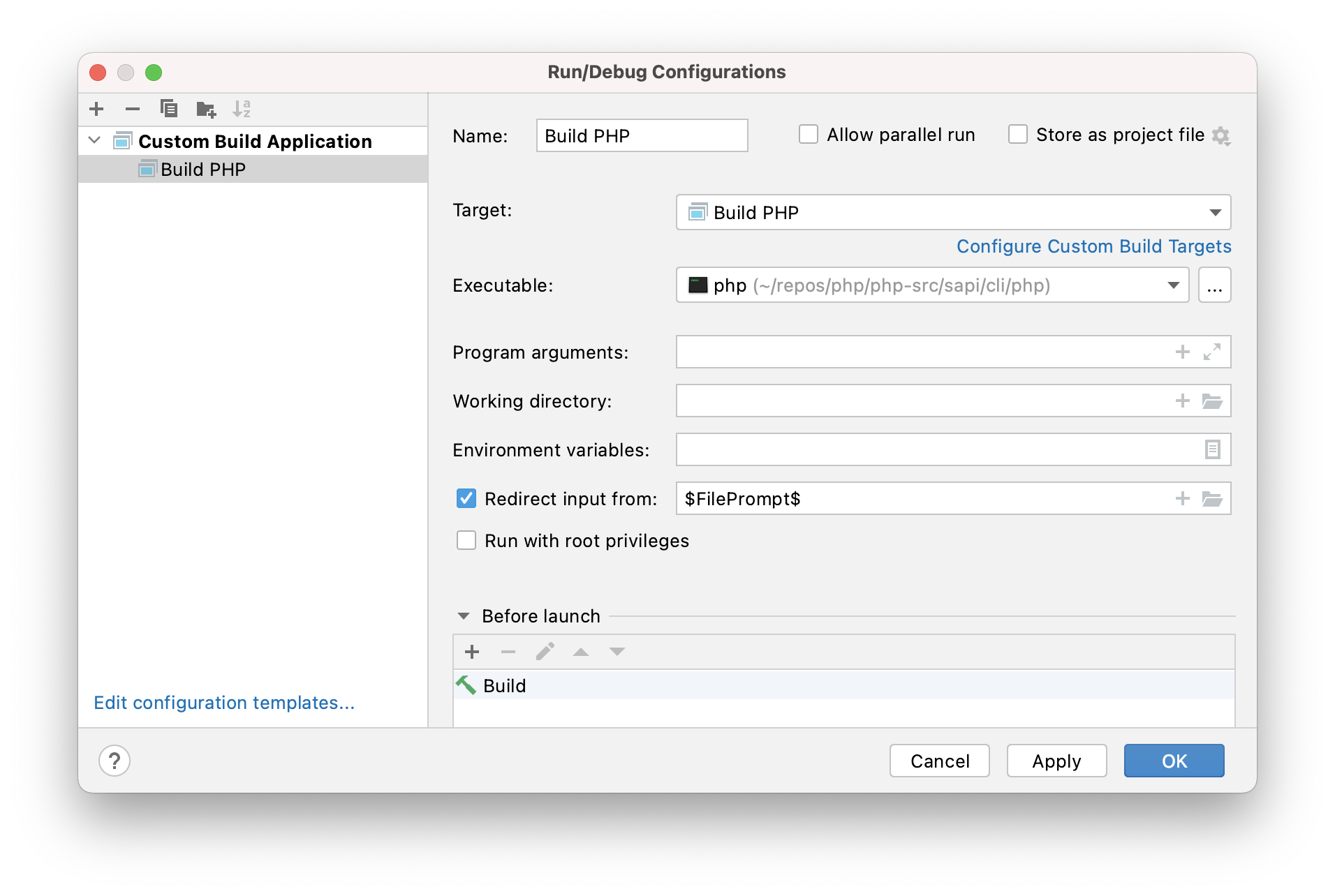 Use the +-button to create a new configuration and choose Custom Build Application from the menu that appears. I named my configuration “Build PHP” and I chose my “Build PHP” target (created earlier) from the Target dropdown list. For the executable, I entered the path to the PHP CLI built by this project (remember, it’s at sapi/cli/php). Last, I checked “Redirect input from” and entered the JetBrains variable $FilePrompt$. In this way, whenever you chose to run PHP from within CLion, it will prompt you with a file dialog to execute through the PHP interpreter. This lets you select a PHP script to run and test/debug whatever feature you’re working on.