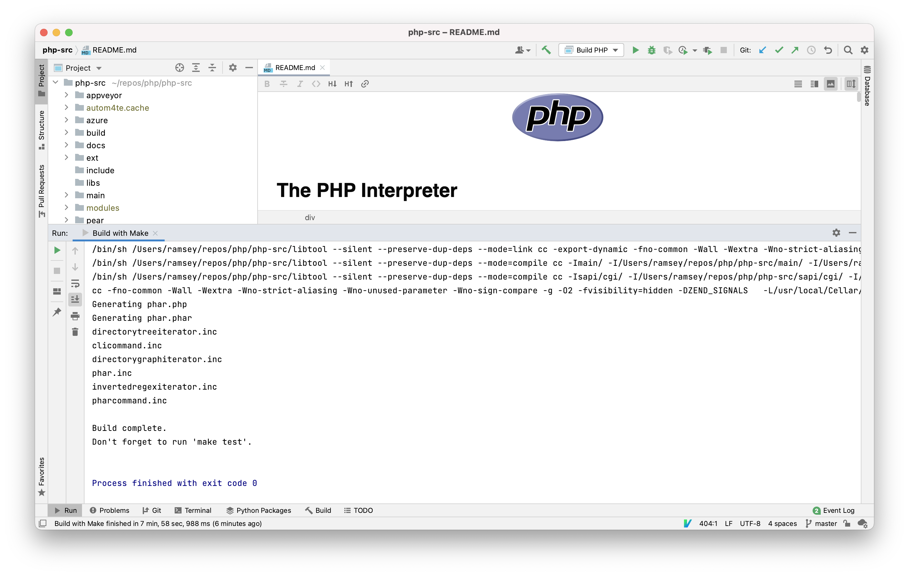 Now, click the hammer icon (🔨) or select Build -> Build Project to build PHP, or select Build -> Clean to run the make clean command.