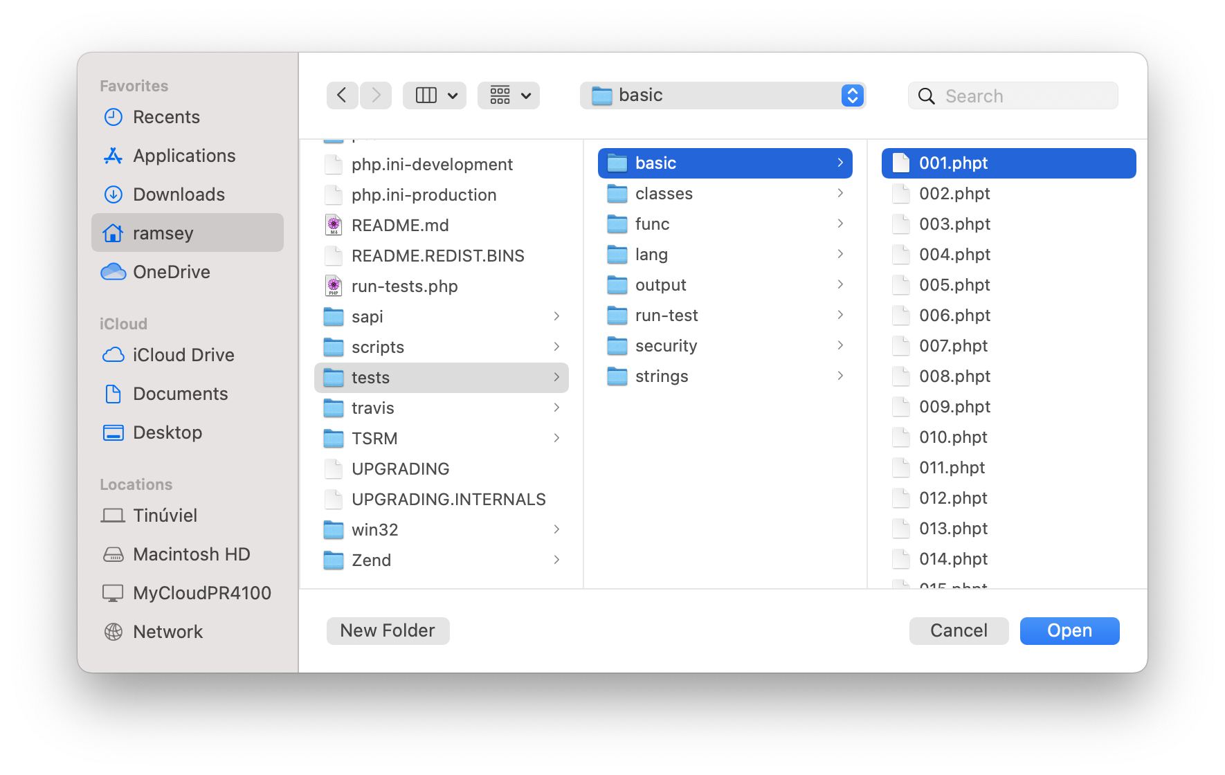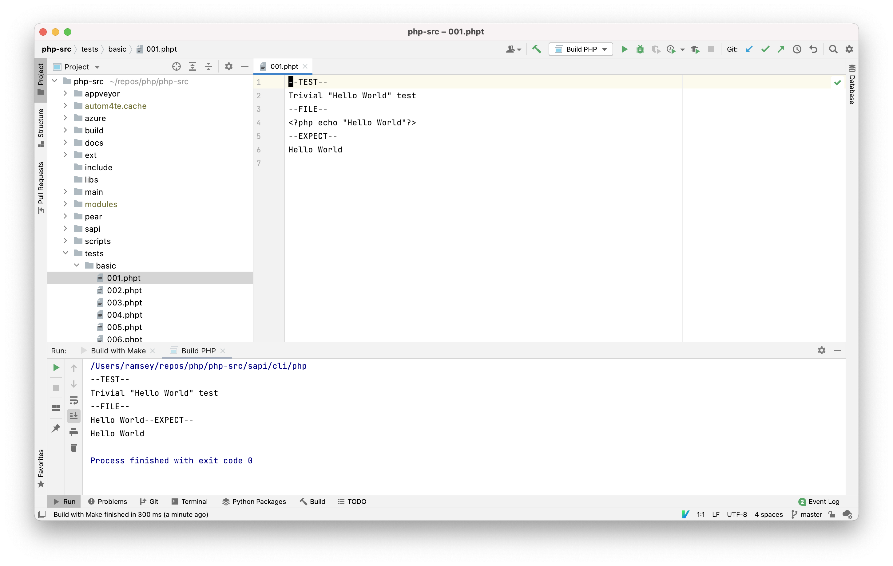 If you click the play icon (▶️) or choose Run -> Run ‘Build PHP’, it will prompt you to select a file and run that file as a PHP script. In the following, I’ve selected one of the .phpt tests to execute this way.