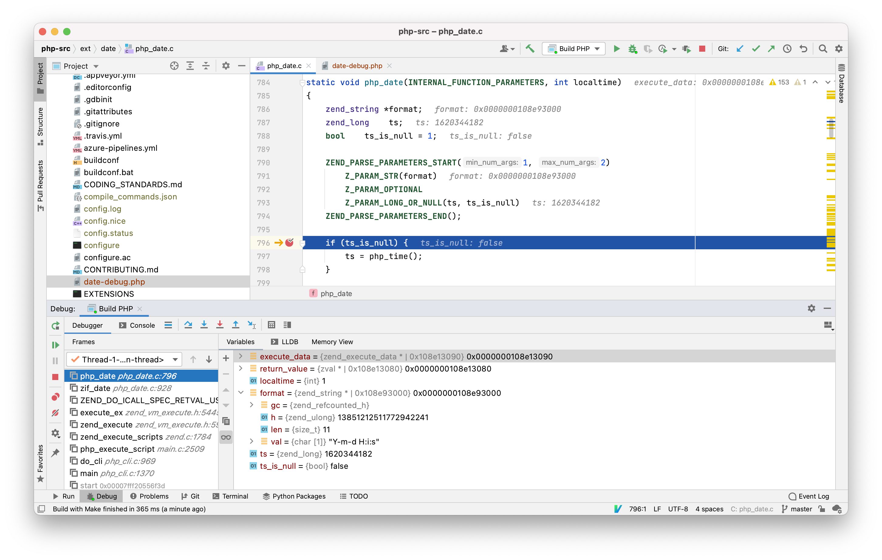 When you click the debug icon (🪲) or choose Run -> Debug ‘Build PHP’, CLion will prompt you to select a file, just like it does when when you click the play icon, as described earlier. When I choose the date-debug.php file, it begins executing it and then stops at the breakpoint in the C code, which happens to be the code called when using the PHP date() function. As you can see, I’m now able to examine the memory and variables in this function, including the zvals.